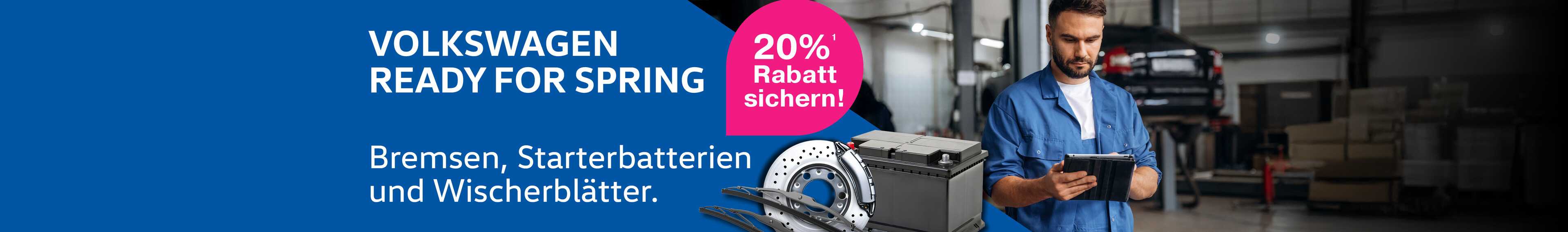 Mit frischer Energie ins Frühjahr: Während der Volkswagen Ready4Spring-Aktionswochen erhalten Sie 20%1 Teilerabatt auf ausgewählte Original Bremsenteile, Starterbatterien und Wischerblätter.